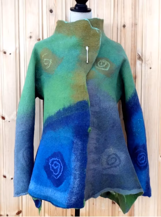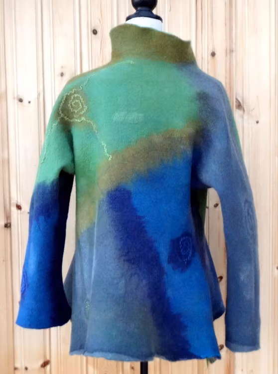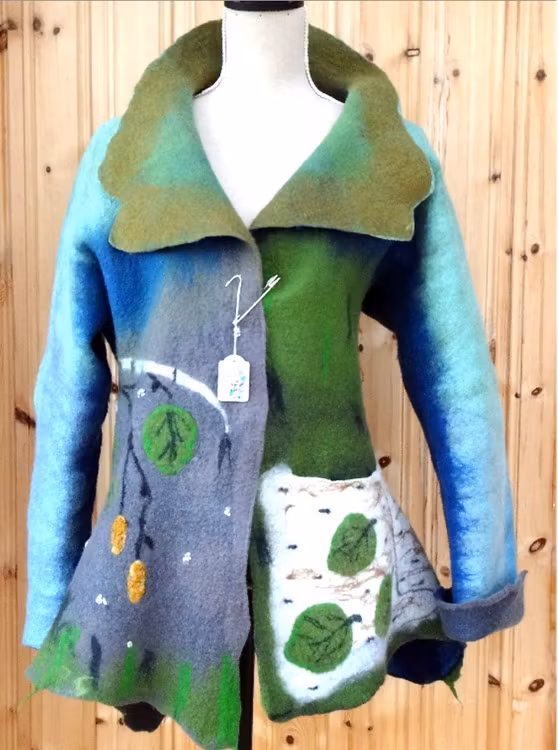 Vår vackra Natur och ett magnifikt landskap ger enorma krafter för att skapa den enastående handtovade konstjackan med en vacker tavla på ryggen: björkar, vatten, blommor, fåglar och båt - människa i harmoni med Naturen.