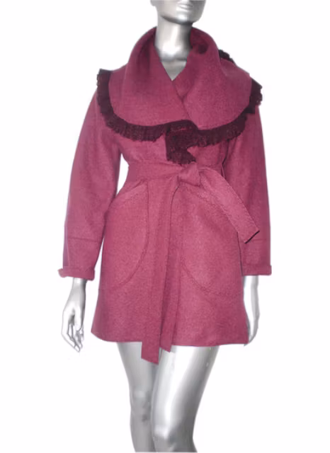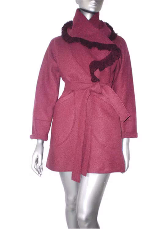 Den långsträckta jackan ur filtad tunn ull med italiensk stickad spets av mohair. Spetskrage på jackan ger ett speciell elegant utseende. Om man vänder jackan upp och ner, då förvandlas den till en kortare modell med en huva. Du kan enkelt ändra utseendet på jackan, draperingar och stapling av krage. Tack vare det fantastiska tyget i filtad ull är jackan mycket lätt och tunn, men den är varm och mysig.