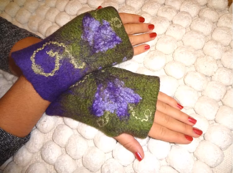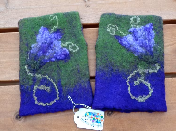 Snygga, sköna, handgjorda, tovade/ filtade pulsvärmare med vackra lila klockor på en sida och med vackert mönster, på den andra sidan. Lite tjockare modell, som gör de extra varma. Dekorerade även med silkefiber och ullnepps. Två i ett - vändbara gör att du kan variera mellan olika mönster, som passar dig bäst till din dagliga klädsel. One size passar de flesta händer.