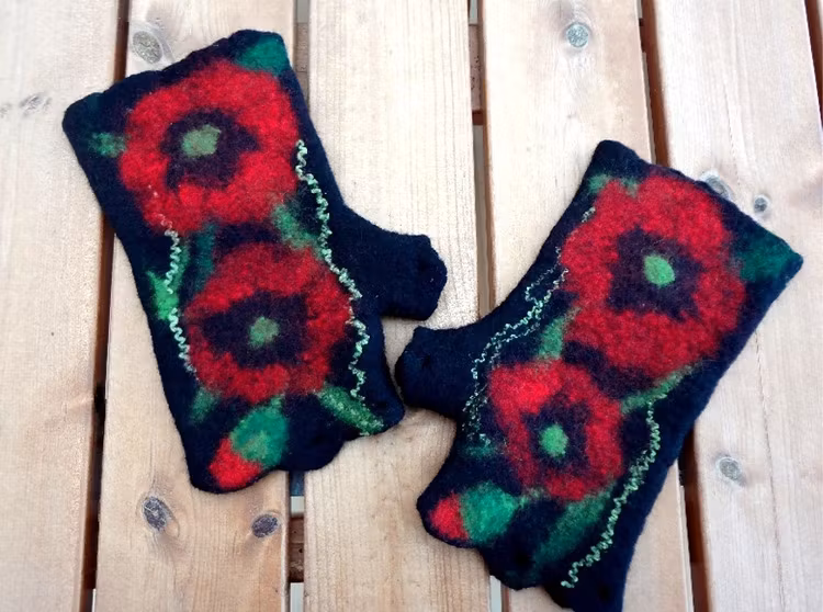 Tjusig design - på den första sidan mönster med vacker vallmo, den andra sidan är svartfärgad. Två i ett - vändbara gör att du kan välja mellan vackra vallmoblommor eller klassisk svart. One size passar de flesta händer. Ser fin ut i kombination med vallmo-kjol och hårband.