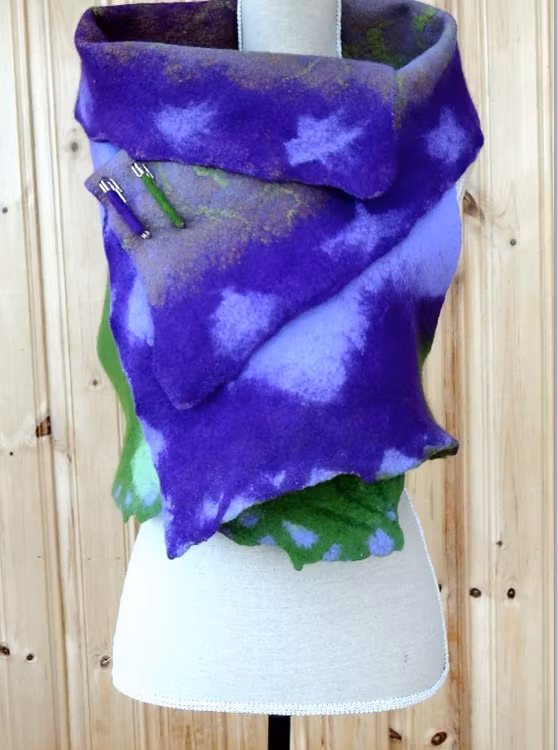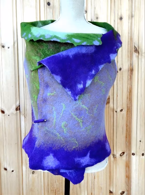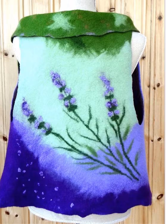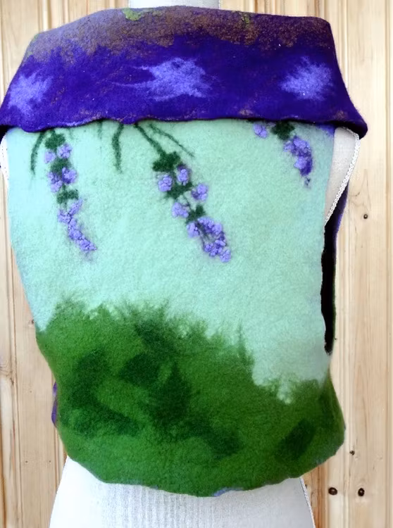 Vändbar väst-jacka i fina vackra färger i lila-lavendel-grön nyanser med fantastiska mönster av lavendel på ryggen på en sida och två hjärtan i 3-D på den andra. Ett helt unikt plagg i vilket du inte kommer kunna gå obemärkt. Du får 6 variationer i ett plagg genom att vända åt/på olika sidor, även vända upp och ner, eller vända fram och bakåt. Från väst till en bolero- väst kan Du få fram nya mönster vid varje tillfälle. Två broscher kommer att hålla den bärbara konsten. Bröstvidd och passar de flesta storlekar från 38 upp till 48.