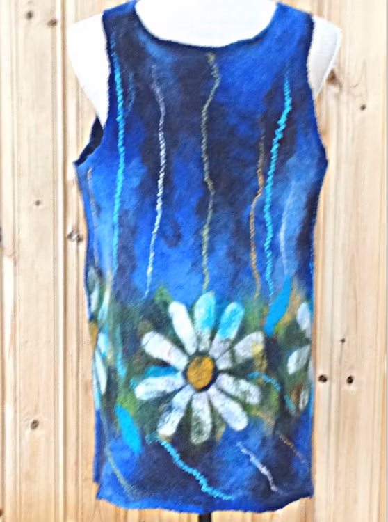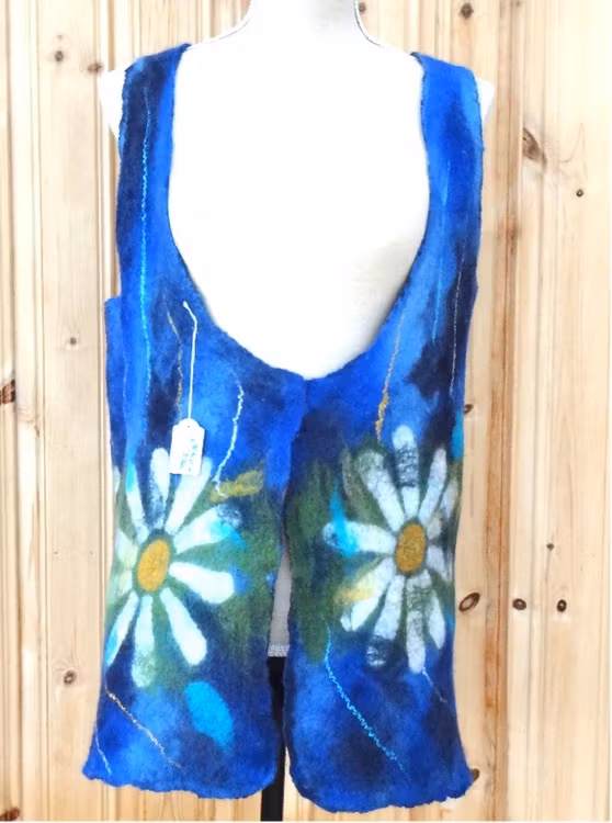 Mycket vacker väst för Dig, som gillar kamomiller. Tunnare modell, som passar alla årstider även på sommaren. Dekoreras med silkesfiber.Handtvätt 30ºTillverkare