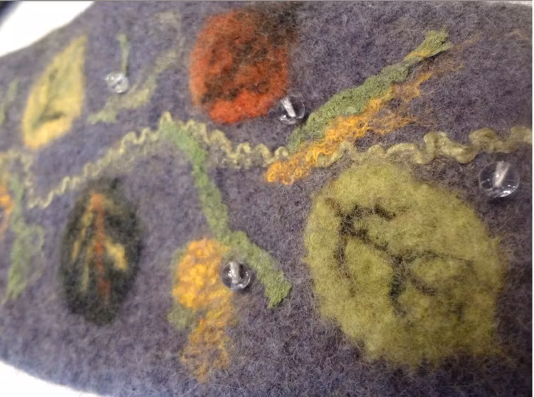 Tjusiga, sköna, handgjorda, tovade/ filtade vantar med vackra höstfärgade blad och bergkristallspärlor, som symboliserar regndroppar. De är extra tjocka, varma och mjuka att gå i. Dekorerades även med grön silkechiffong och silkefiber.