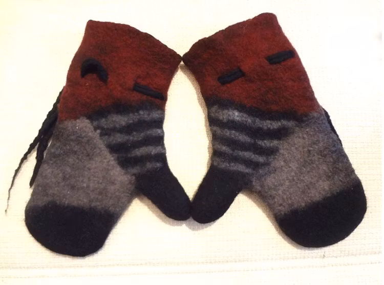 Tjusiga, sköna, handgjorda, tovade/ filtade vändbara vantar med bukiga bär på en sida och med trevligt mönster på den andra sidan. De är varma och mjuka att gå i. Dekorerade även med knytband. Du kan lätt välja den sida, som passar dig bäst till din dagliga klädsel.