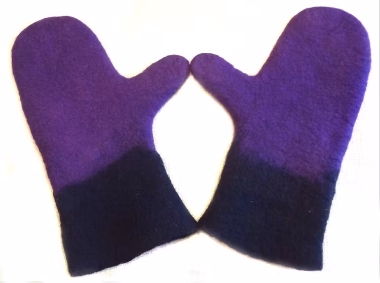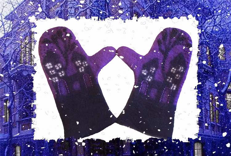 Tjusiga, sköna, handgjorda, tovade/ filtade vändbara vantar med trevligt motiv av hus och träd på framsidan och lila-svart färgad baksida. De är varma och mjuka att gå i även under kall vintertid. Dekorerade även med broderi och glaspärlor. Du kan lätt välja den sida, som passar dig bäst till din dagliga klädsel.