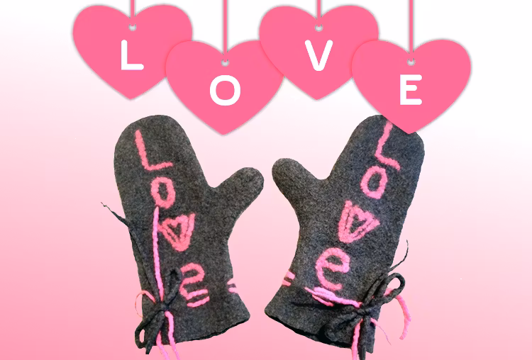 Tjusiga, sköna, handgjorda, tovade/ filtade vändbara vantar med ordet Love på framsidan och två hjärtan på baksidan. Mycket fin grå-rosa färgkombination. De är varma och mjuka att gå i även under kall vintertid. Dekorerade även med knytband. Du kan lätt välja den sida, som passar dig bäst till din dagliga klädsel.
