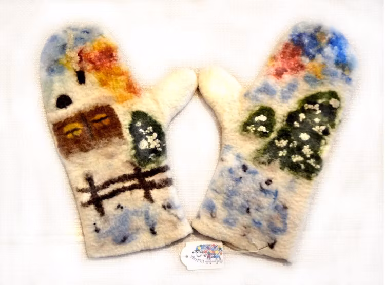 Tjusiga, sköna, handgjorda, tovade/ filtade vantar med vackert vintermotiv: liten stuga i vinterskog. De är extra tjocka, varma och mjuka att gå i.