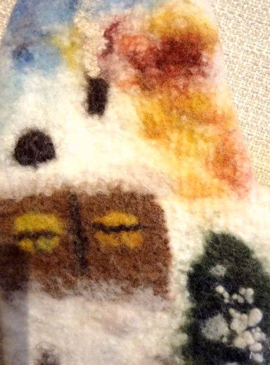 Tjusiga, sköna, handgjorda, tovade/ filtade vantar med vackert vintermotiv: liten stuga i vinterskog. De är extra tjocka, varma och mjuka att gå i.Vändbara - vi