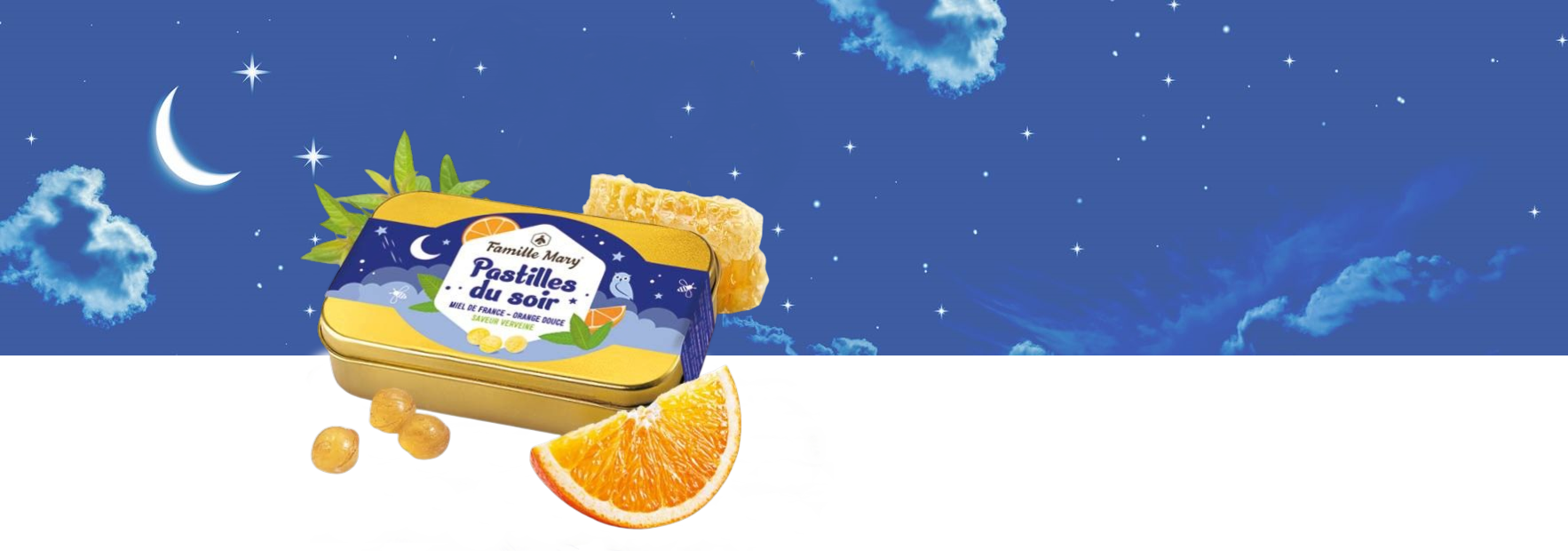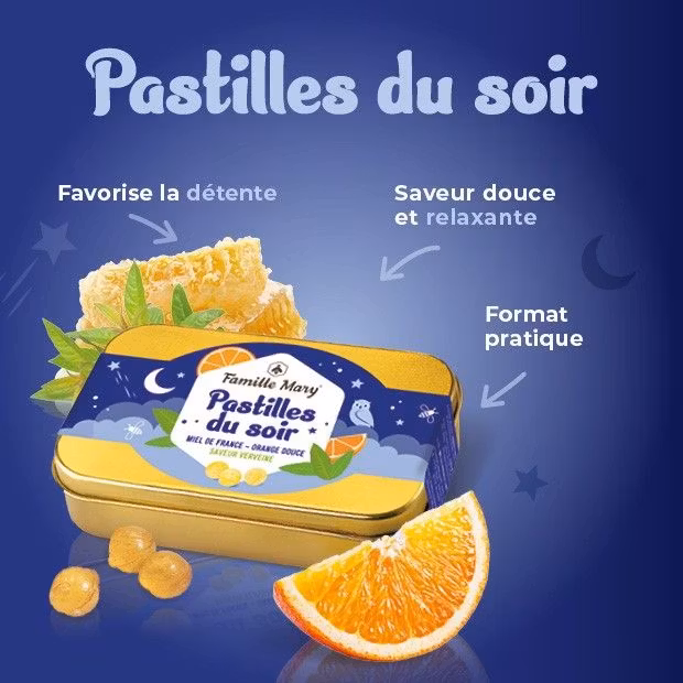 Låt dig förföras av kvällspastiller, en delikat kombination av fransk honung, verbena och söt apelsin, för en utsökt och avkopplande paus i slutet av dagen.