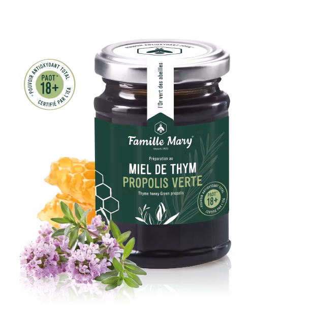 ![]() | Mirakelprodukt med timjanhonung och grön propolis kombinerar två huvudsakliga aktiva ingredienser från bikupan för att hjälpa dig att begränsa vinterns åkommor. Den har också en stark antioxidantisk effekt, total antioxidantkraft 18 (PAOT). Grön propolis skördas av bin på växten Baccharis Dracuncunlifolia. Denna propolis används också, som brun propolis, av bin för att skydda bikupan från mikrober och virus. Grön propolis har Artepillin C, en aktiv ingrediens som ökar nyttiga egenskaper. |
