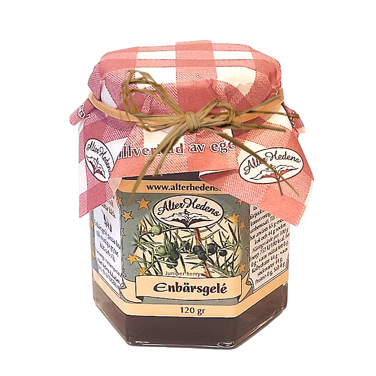 Enbärsgele passar till kött, vilt, fågel och mustiga grytor. Enbärsgelé går även bra att använda som marmelad. Enbärsgele innehåller enbär från nära naturen och doftar kåda. Den har en god, unik smak som leder tankarna till skog och vilt. Enen har kallats "nordens cypress" och med sin friska doft. AlterHedens egen tillverkning i Norrbotten med egen el från solen. Enbärsgelen är en småskalig delikatess packad i sexkantig glasburk.