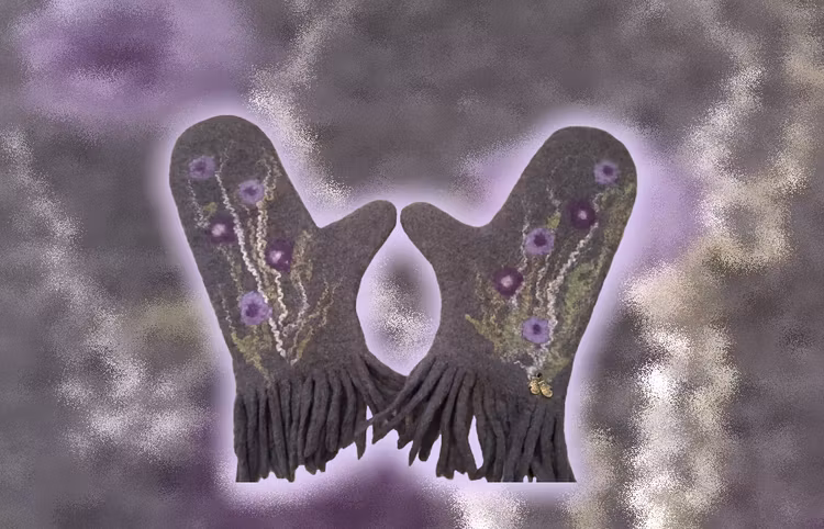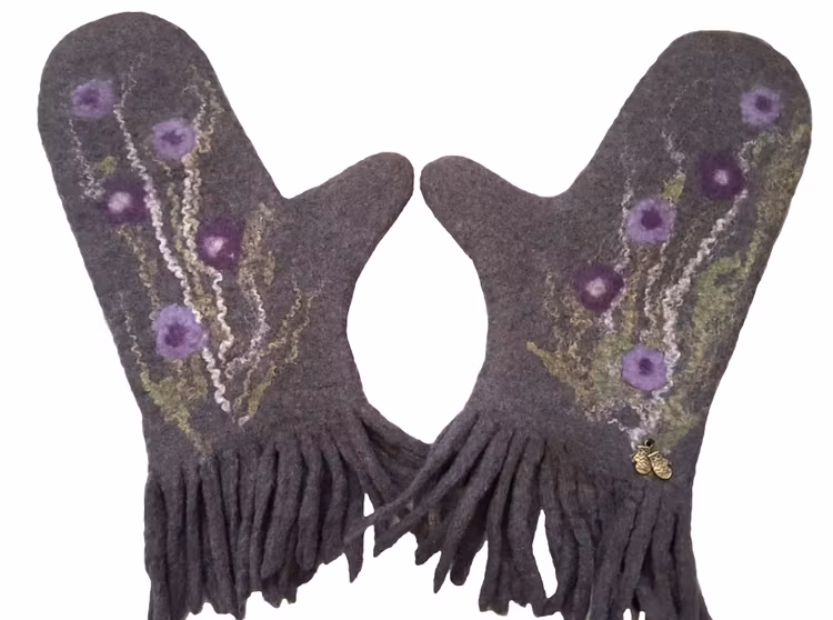 Tjusiga, sköna, handgjorda, tovade/ filtade vändbara vantar med små lila blommor på framsidan och grå färg på baksidan. Mycket fin ljus- mörk lila färgkombination. De är varma och mjuka att gå i även under kall vintertid. Dekorerade även med knytband. Du kan lätt välja den sida, som passar dig bäst till din dagliga klädsel.