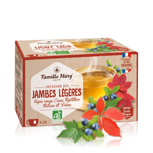 Har du ofta en känsla av tunga ben? Har du åderbråck på grund av dålig blodcirkulation? Famille Mary är din specialist på ekologiska välmåendeprodukter, presenterar sin Organic Light Legs Infusion, ett örtte för blodcirkulationen som hjälper dig att återfå lätta ben.