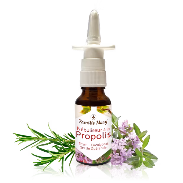 Famille Mary propolis nässpray är en lösning baserad på Guerande salt (de sel de Guérande), propolis, timjan, rosmarin och eukalyptus. Nässpray är en nebulisator dvs. fint botemedel så att det lättare når ut till lungans alla delar. Nässpray Propolis har supereffektiv verkan vid täppa upp näsan.